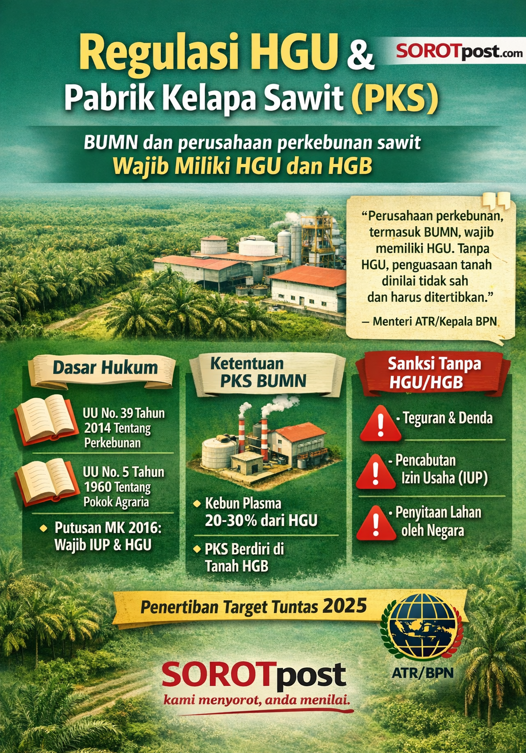 PKS BUMN dan Swasta Wajib Miliki HGU dan HGB, Operasi Tanpa Legalitas Lahan Terancam Sanksi Berat